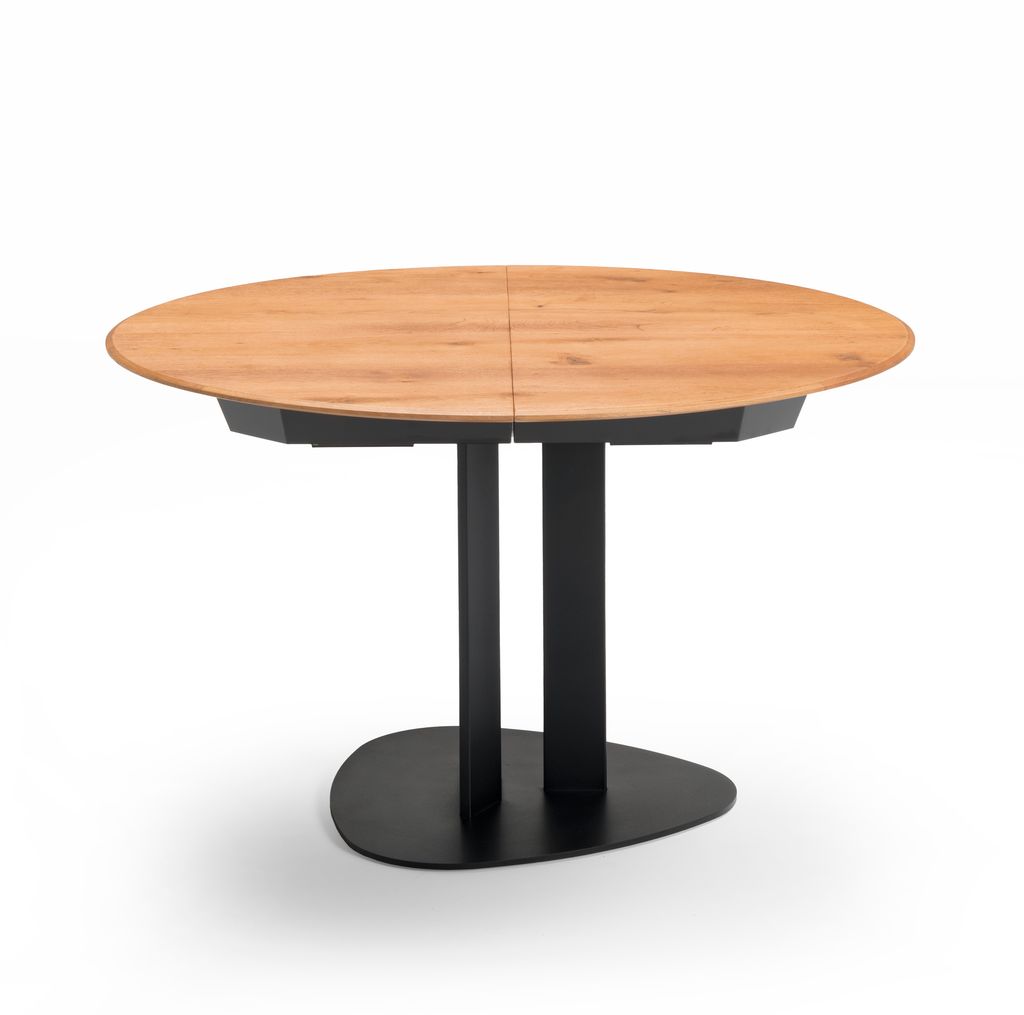 Tischplatten aus 20 mm starker Eiche mit gebürsteter Oberfläche oder aus 12 mm starker glasgekoppelter Keramik. Sockel aus pulverbeschichtetem oder oxidiertem Stahl mit Acryl-Finish.