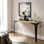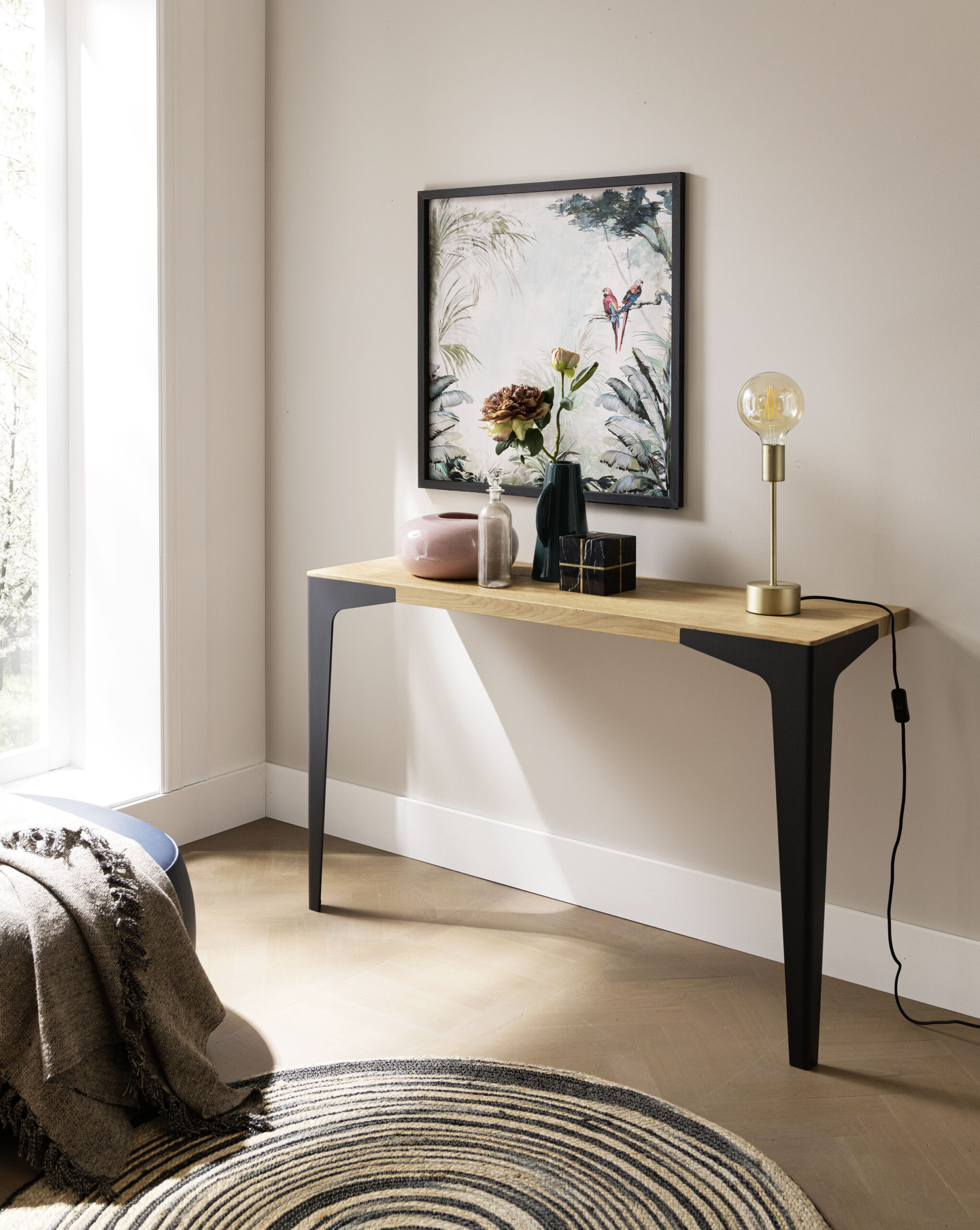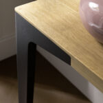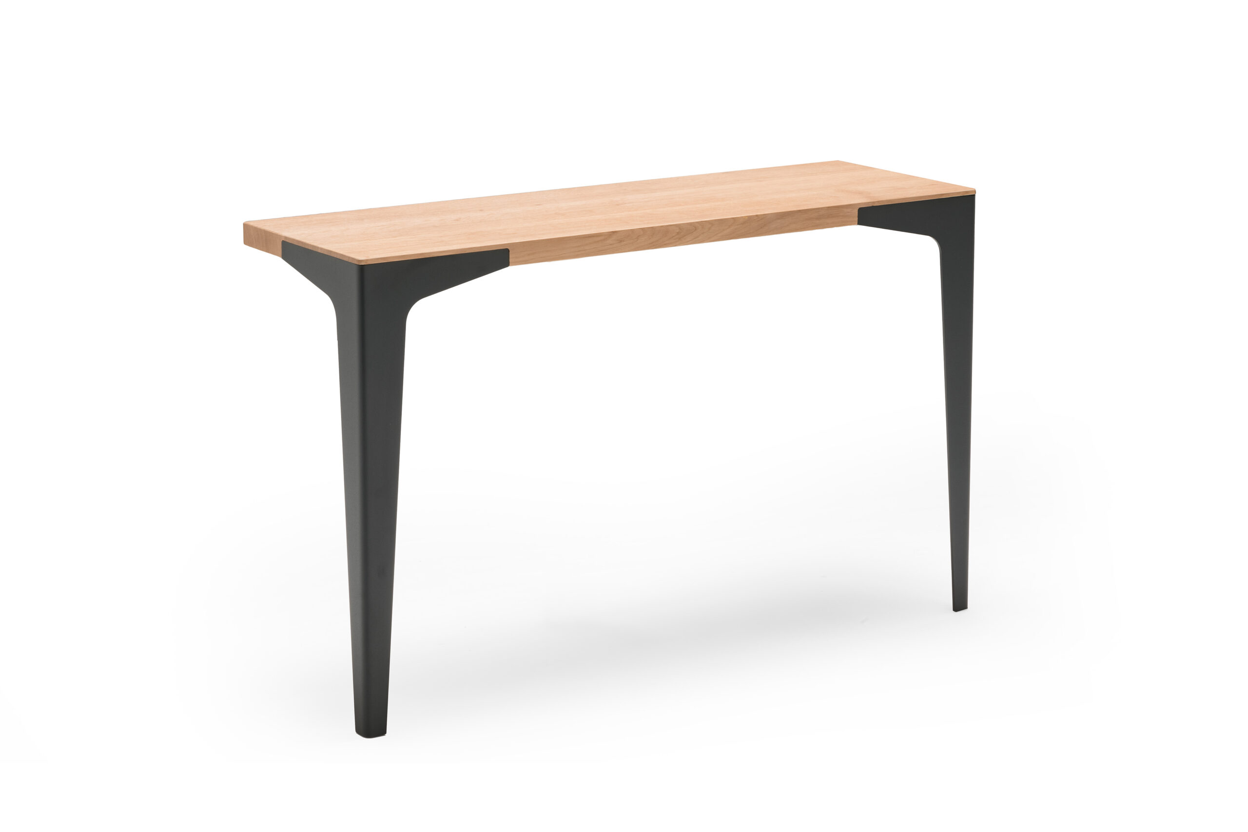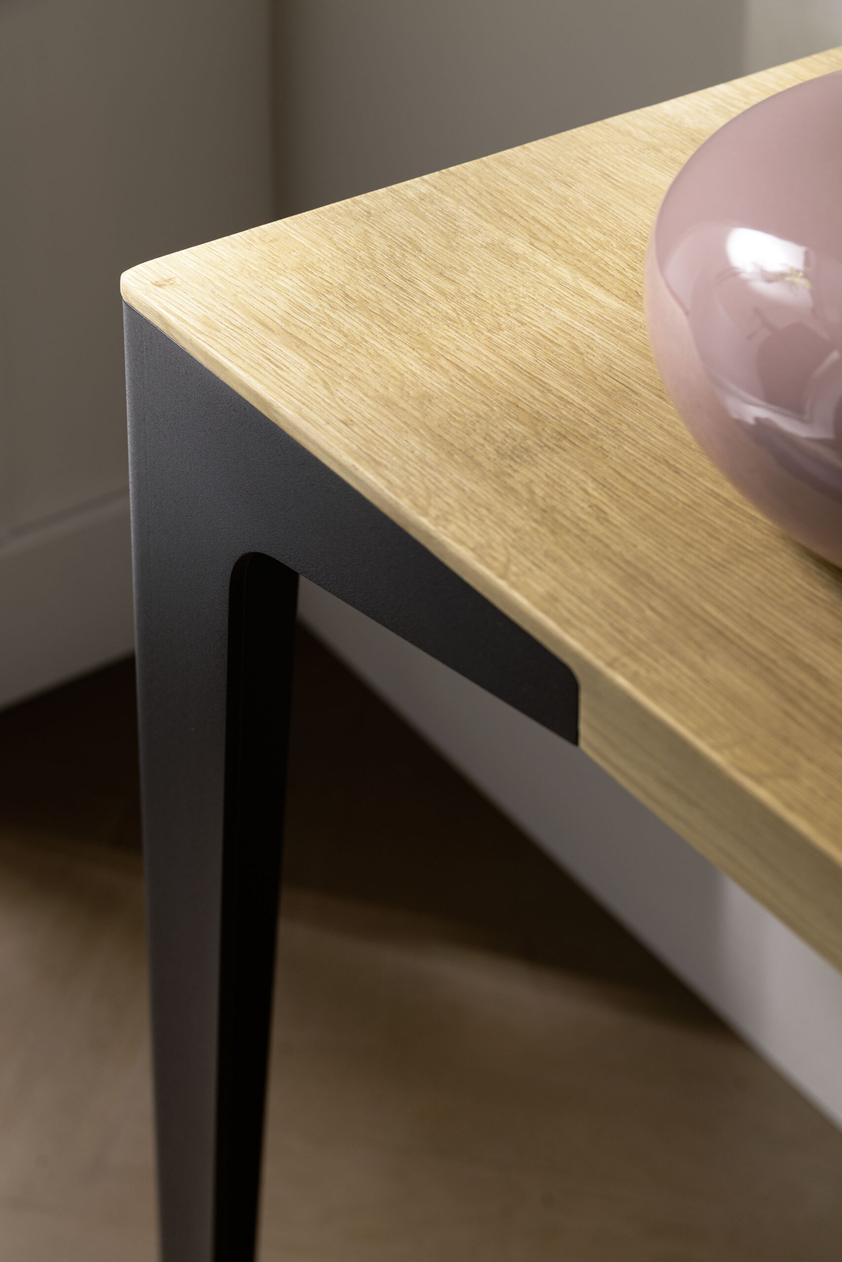 Tischplatten aus 40 mm starker massiver Eiche mit gebürsteter Oberfläche oder massivem, ungebürstetem Canaletto-Nussbaum. Vinylklebstoffe auf Wasserbasis, Zweikomponenten-Acrylfarben. Sockel aus acrylpulverbeschichtetem Stahl.