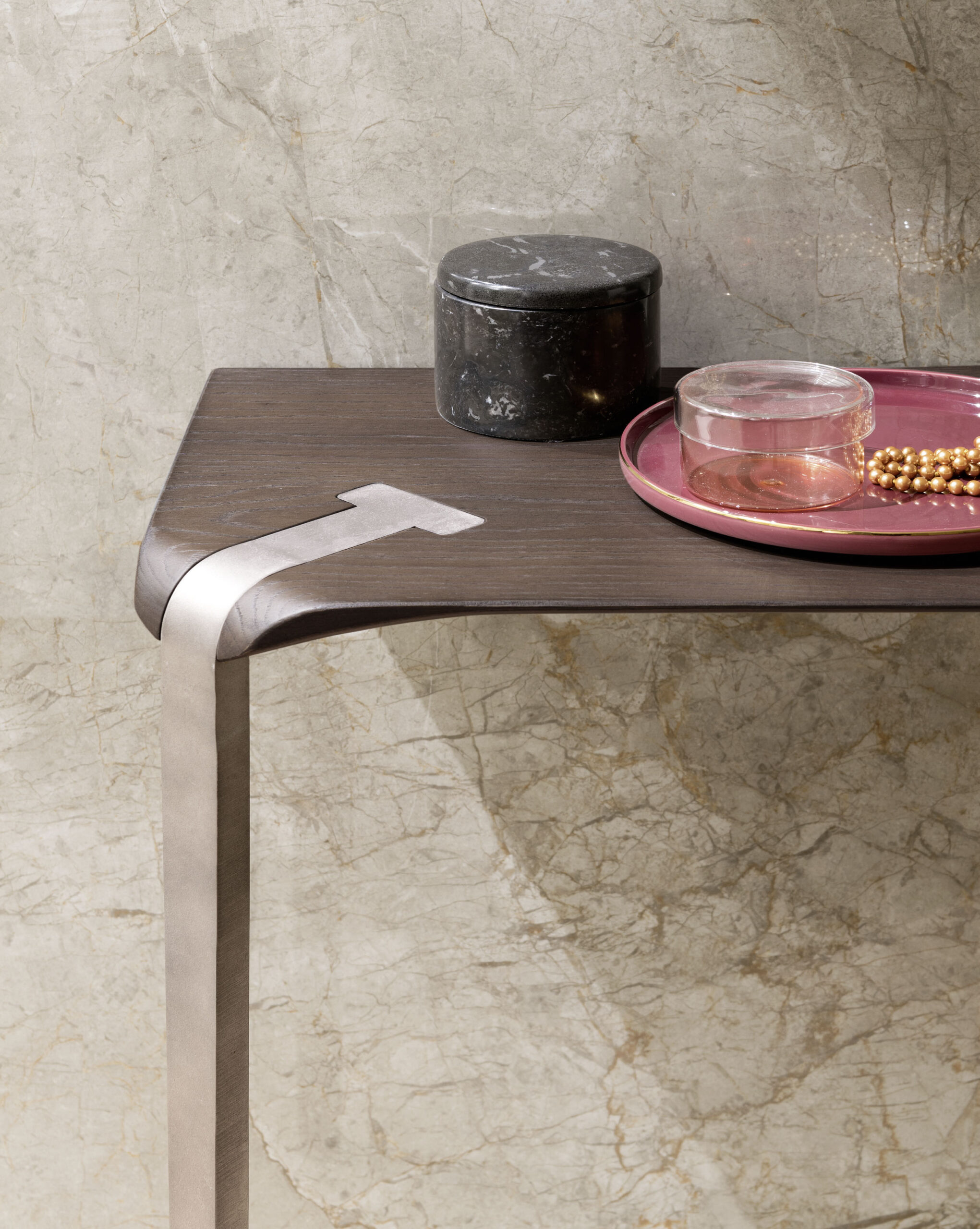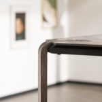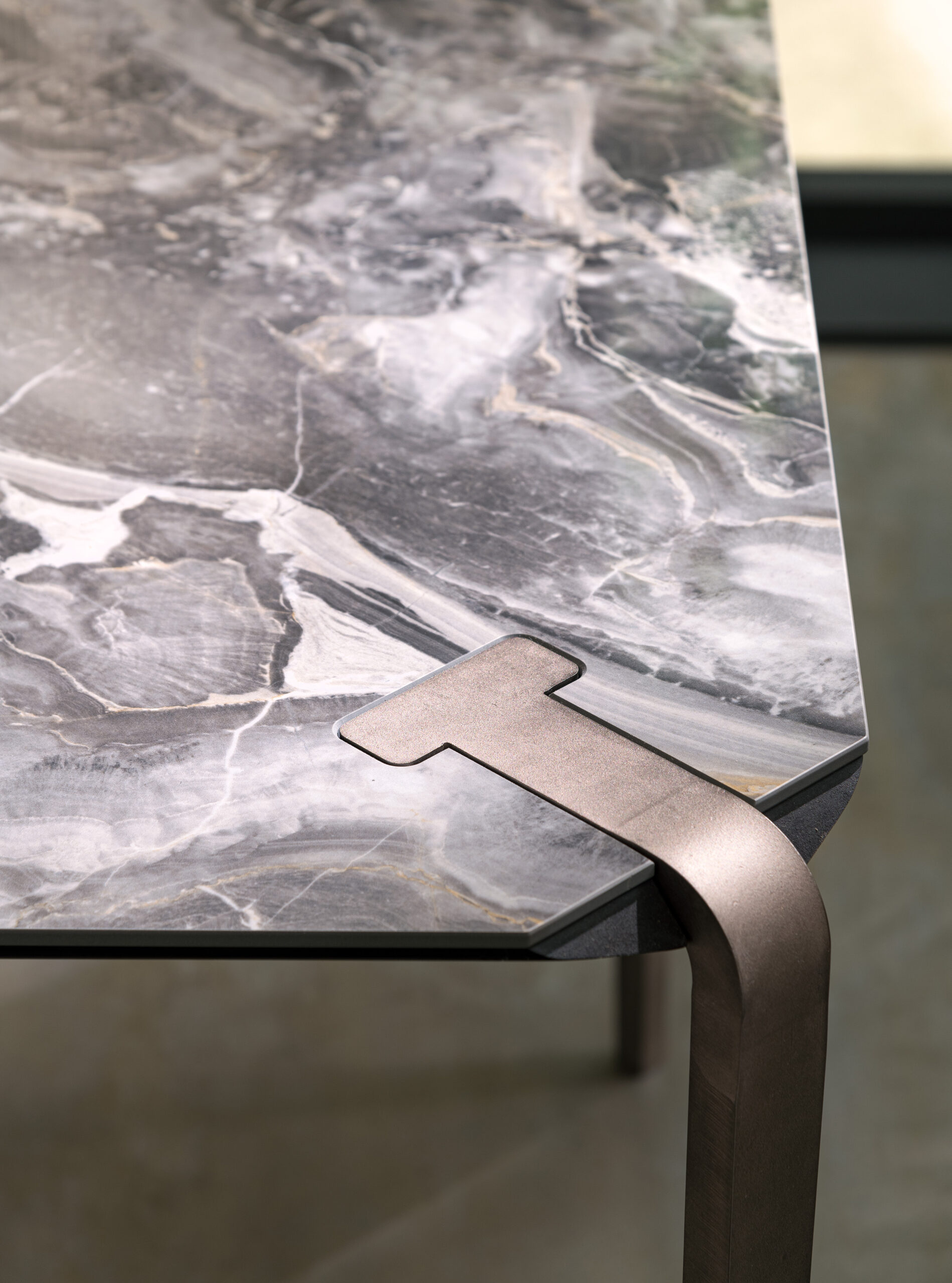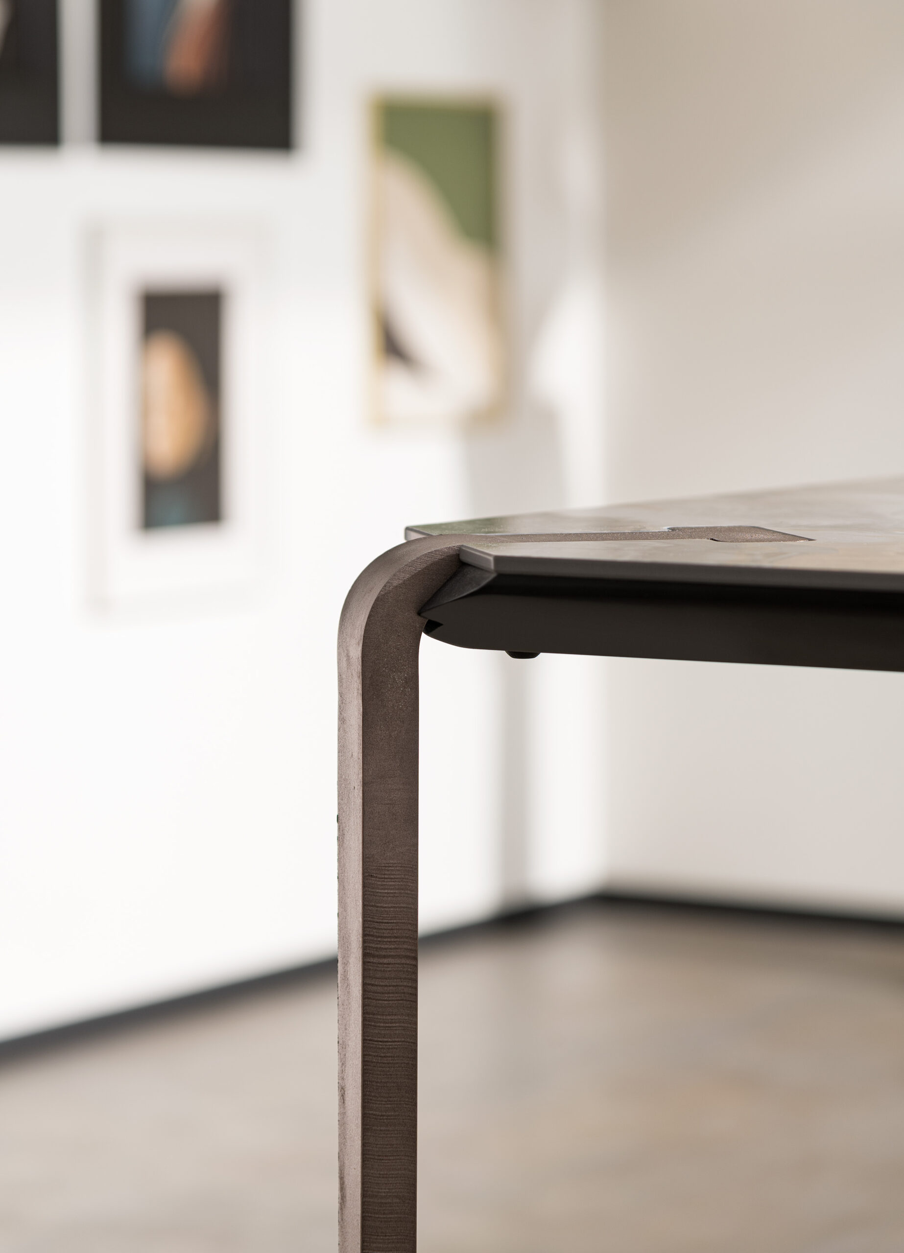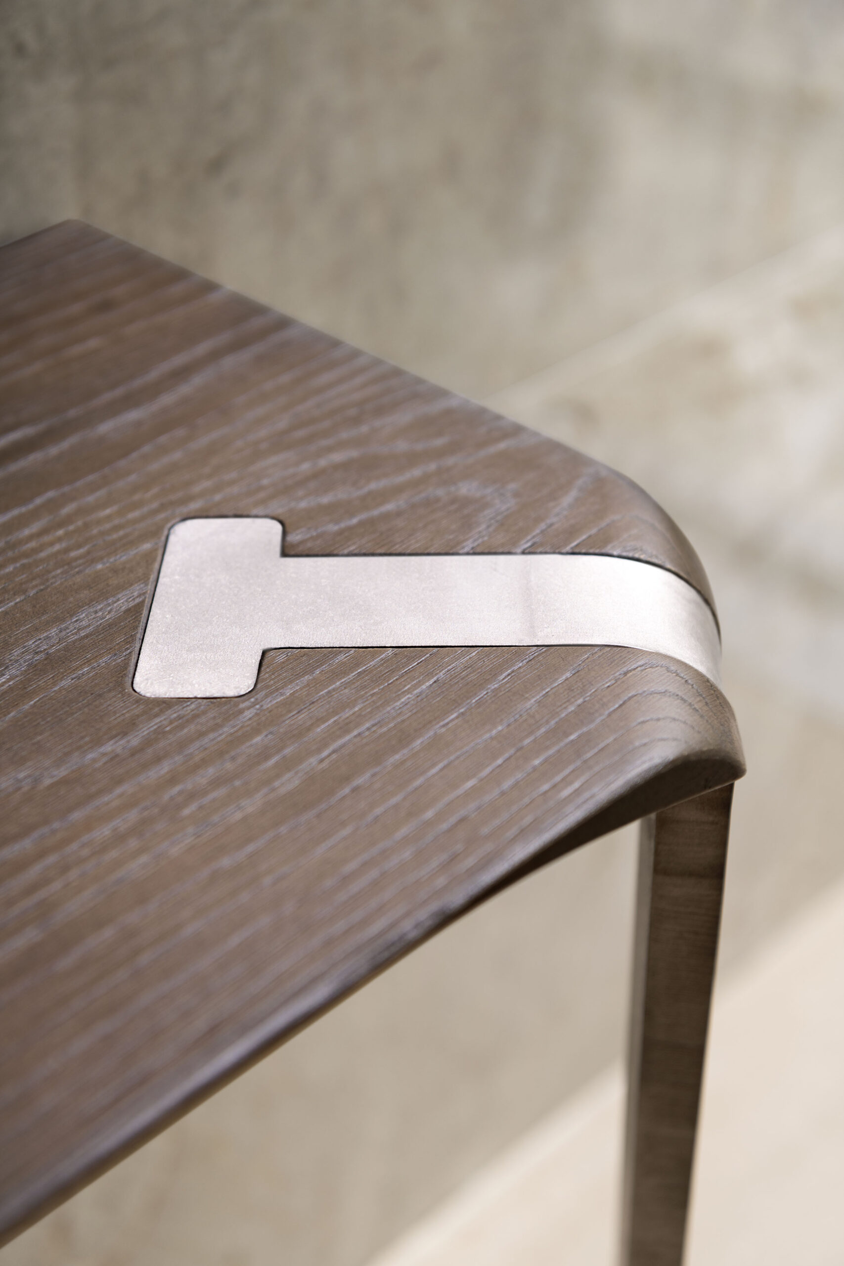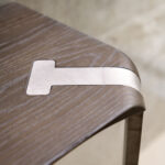 Tischplatten aus 40 mm starker massiver Eiche mit gebürsteter Oberfläche oder ungebürstetem massivem Canaletto-Nussbaum oder 35 mm dick mit Keramikplatte und MDF-Träger. Vinylklebstoffe auf Wasserbasis, Zweikomponenten-Acrylfarben. Sockel aus mit Acrylpulver lackiertem Stahl.