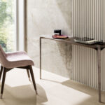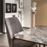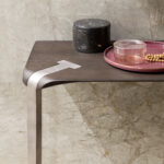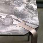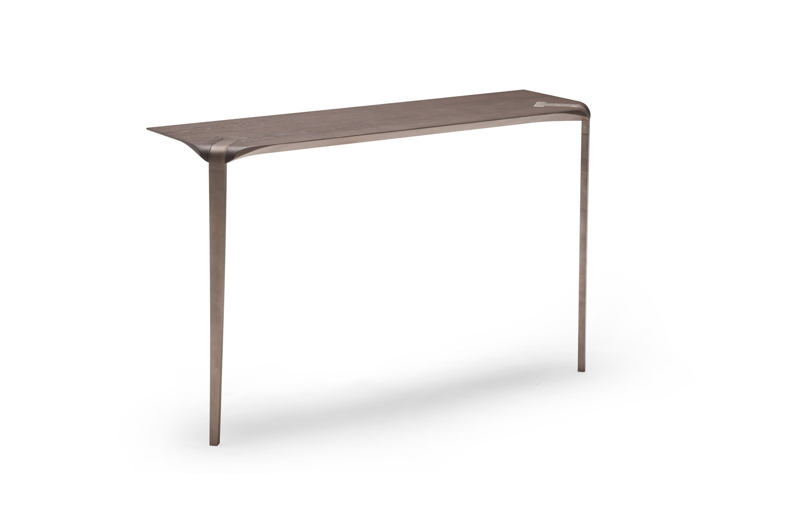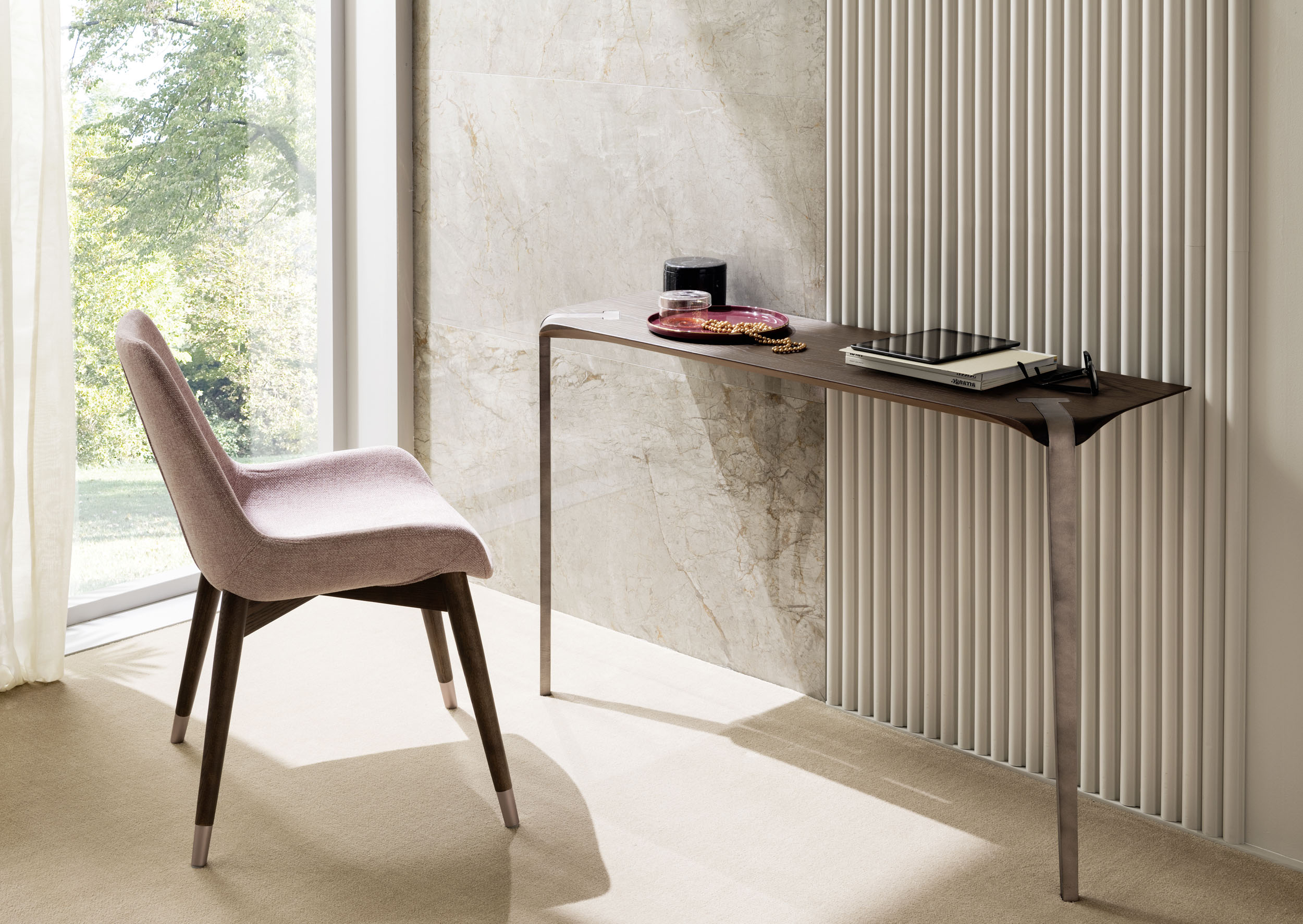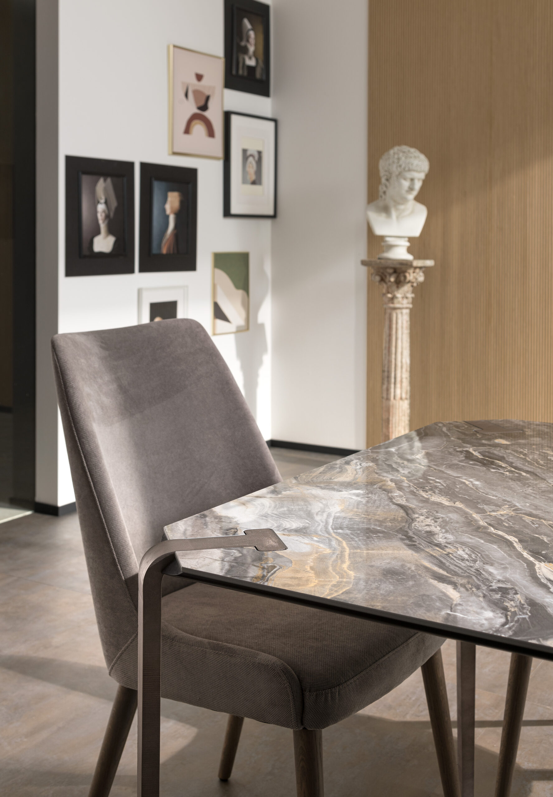 Tischplatten aus 40 mm starker massiver Eiche mit gebürsteter Oberfläche oder ungebürstetem massivem Canaletto-Nussbaum oder 35 mm dick mit Keramikplatte und MDF-Träger. Vinylklebstoffe auf Wasserbasis, Zweikomponenten-Acrylfarben. Sockel aus mit Acrylpulver lackiertem Stahl.