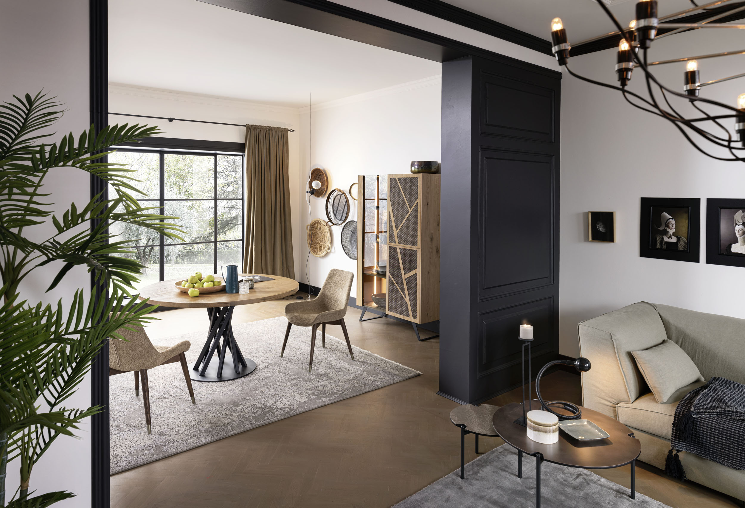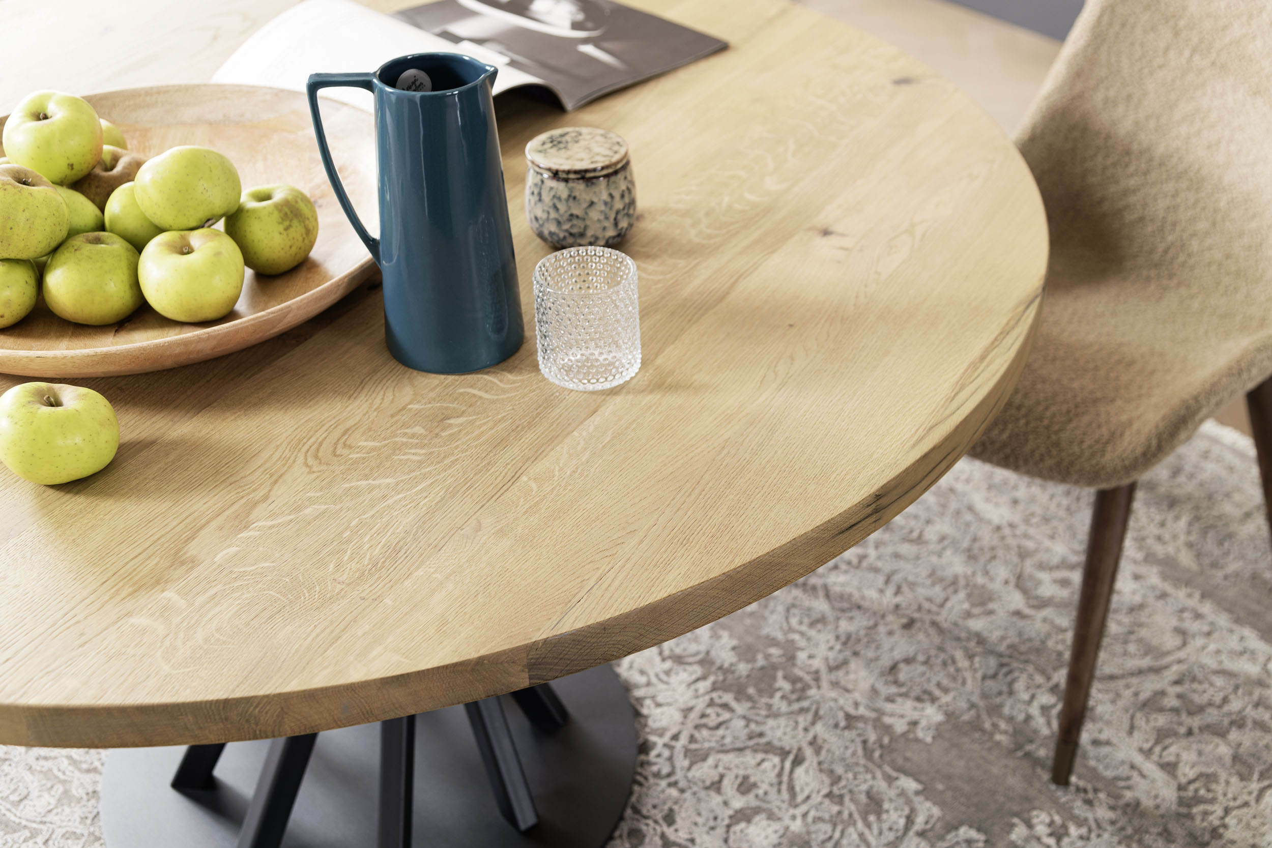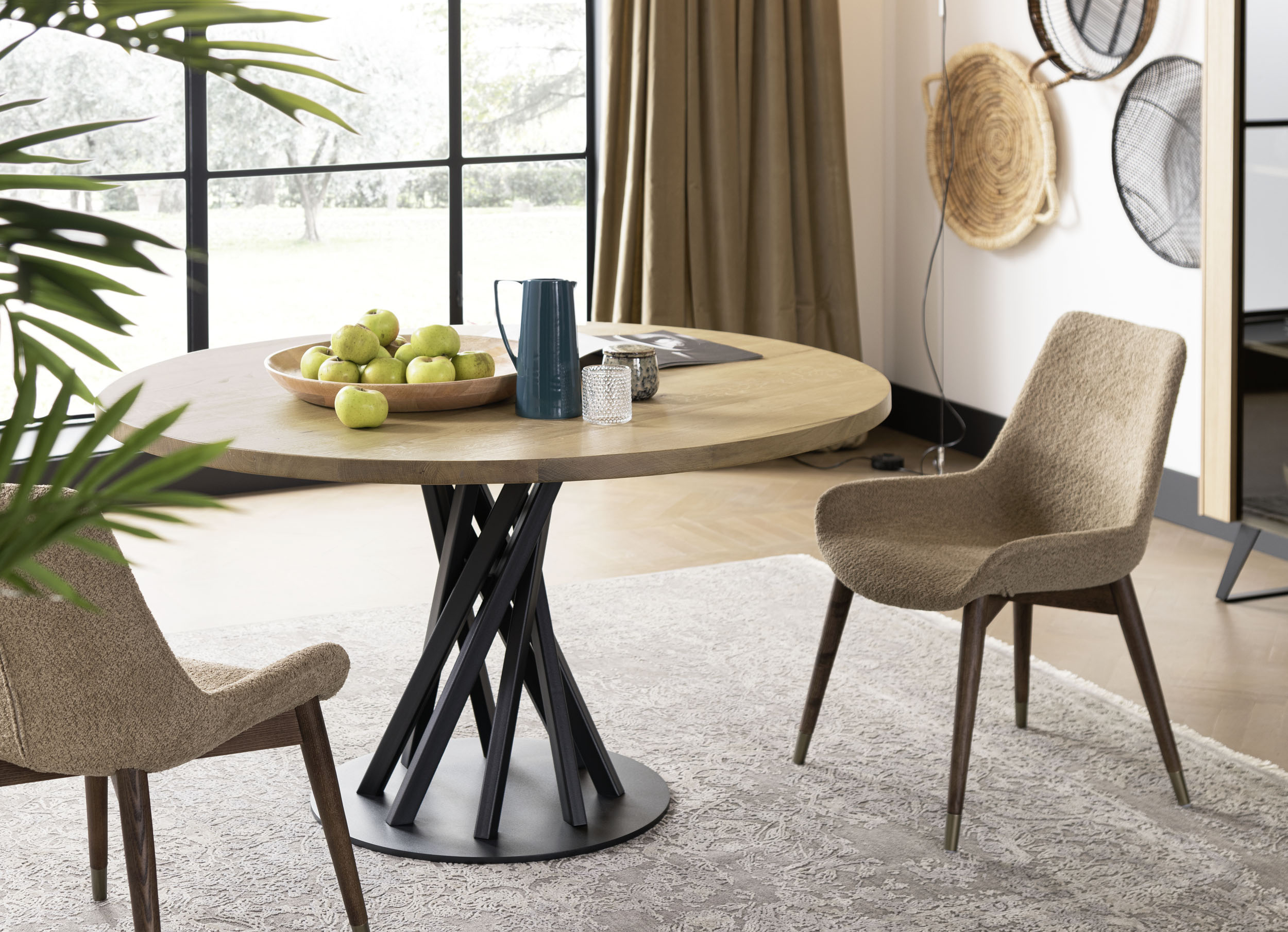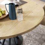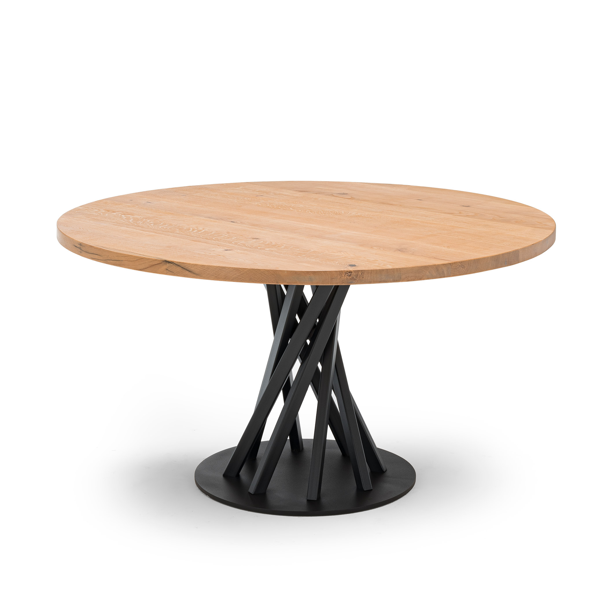 Tischplatten aus massiver Eiche, 40 mm stark, gebürstete Oberfläche, aus Canaletto-Nussbaum. Sockel aus pulverbeschichtetem Stahl mit Acryl-Finish.
