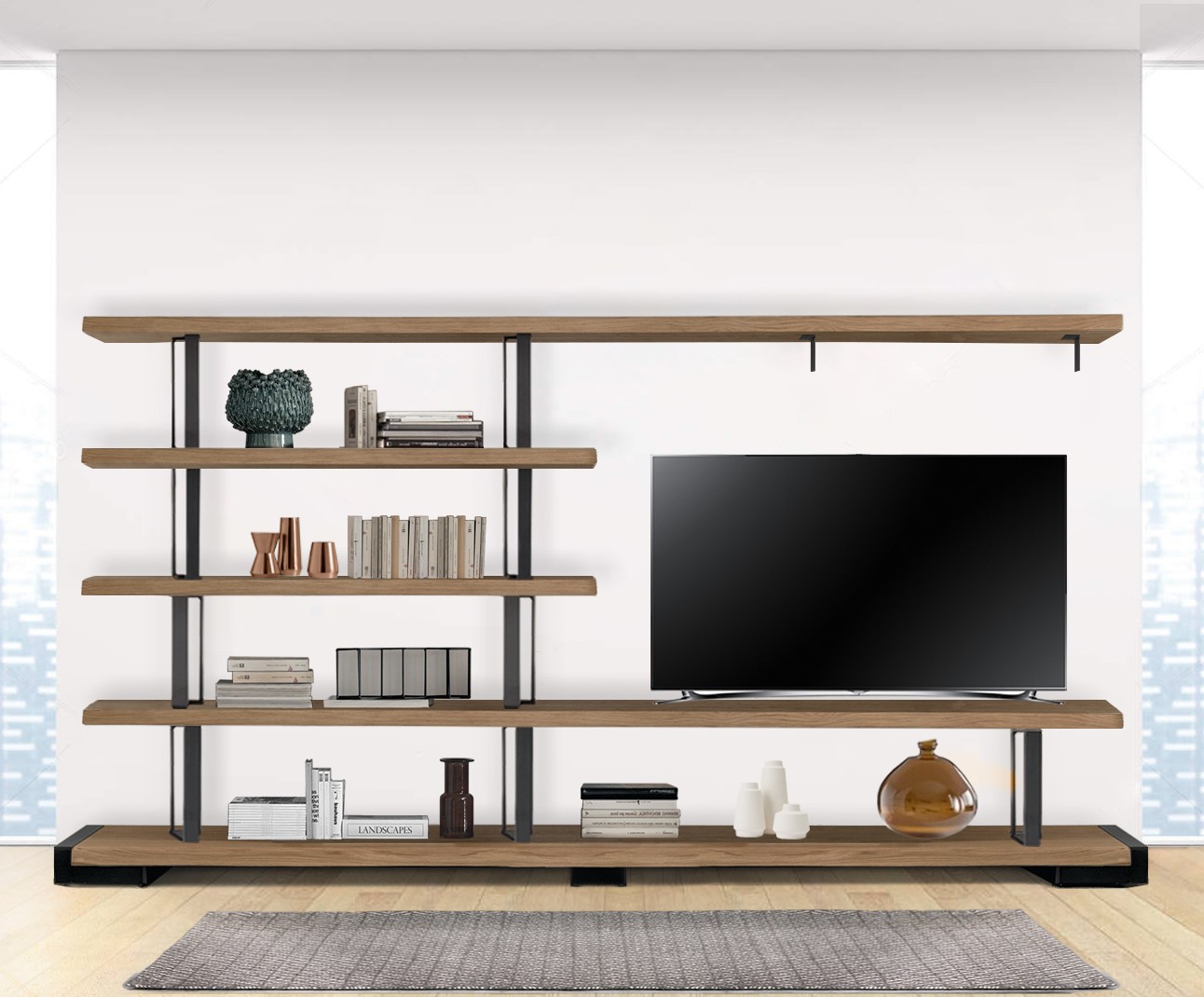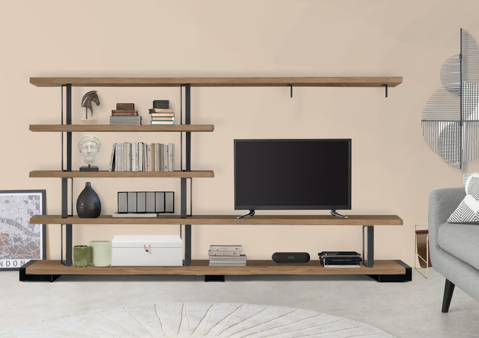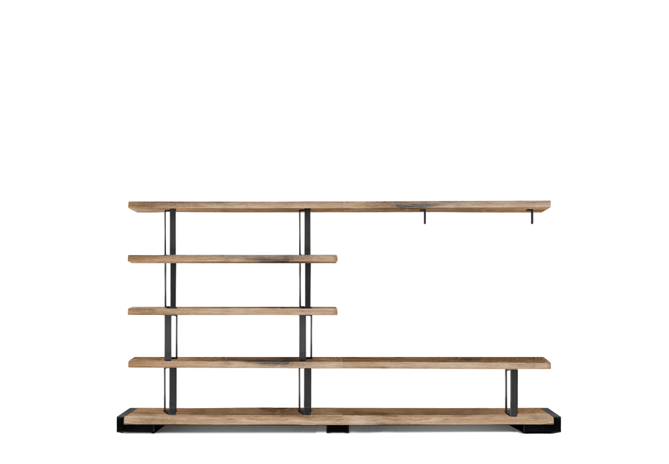Nicht veränderbar Regalsystem aus massivem Eichenholz mit unregelmäßigen Kanten und Strukturstützen aus Eisen mit einem Industry-chic Design. Findest du nicht die richtige Kombination für dich? Bei unseren Fachhändler kann du es nach deinen Bedürfnissen personalisieren.