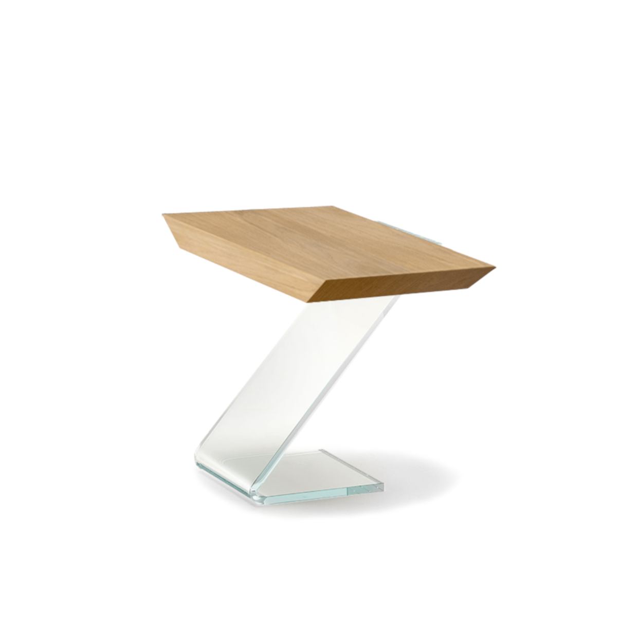 Platte aus massivem Eichenholz St. 60 mm. Untergestell aus hitzegebogenem Glas Extraklar St. 19. Nicht vorgespanntes Glas. Vinylkleber auf Wasserbasis, Zweikomponenten – Acryllack.