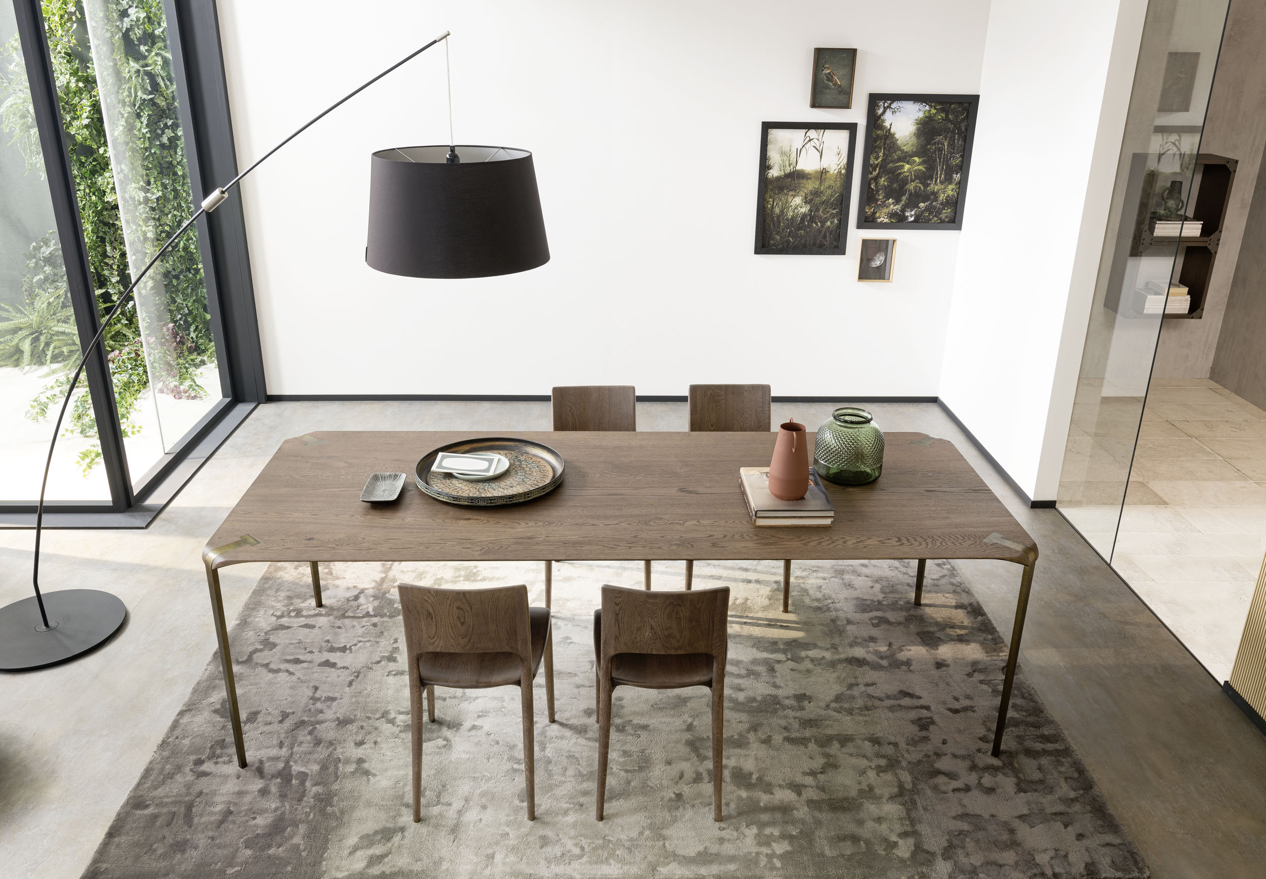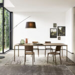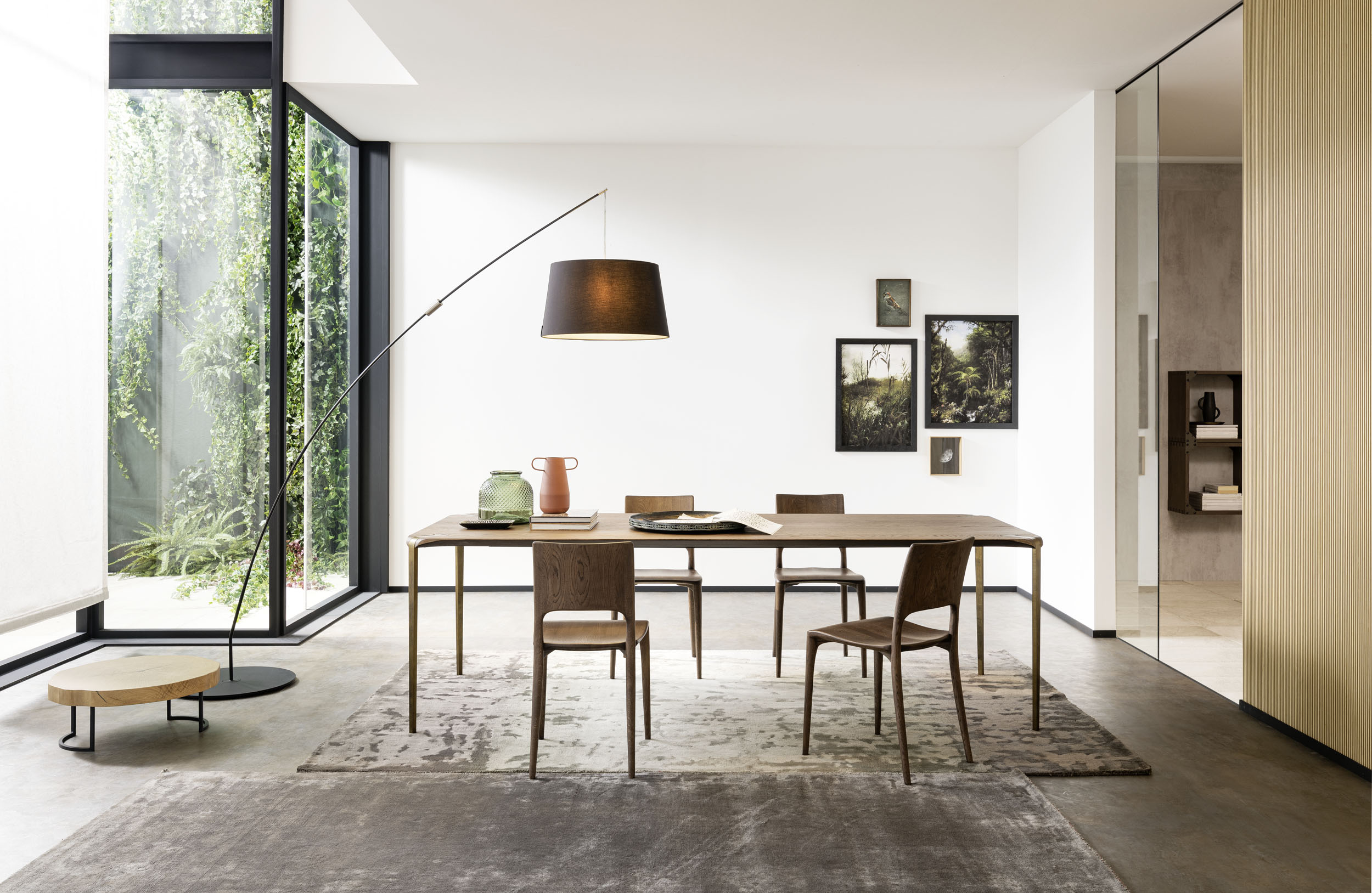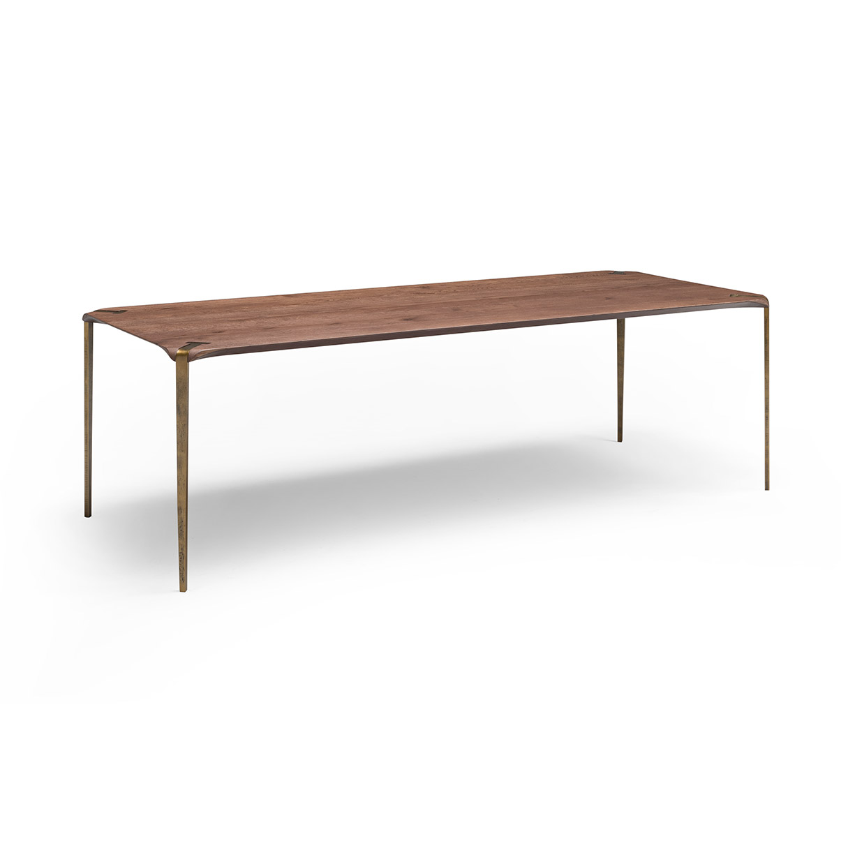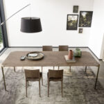 Der Tisch Lio ist das Ergebnis des Bleistifts von Altacorte. Seine schlanken Linien geben dem Raum und der Seele des Betrachters ein Gefühl der Leichtigkeit. Die Beine aus Eisen werden mittels Laserschneiden extrudiert. Gerade das Eisen, ein Material mit einem hohen spezifischen Gewicht, verleiht Stabilität und Festigkeit. Die Platte aus massiver Eiche oder Nussbaum setzt sich als Ikone des modernen Wohnbereichs durch.