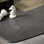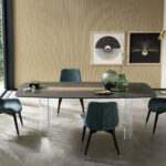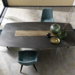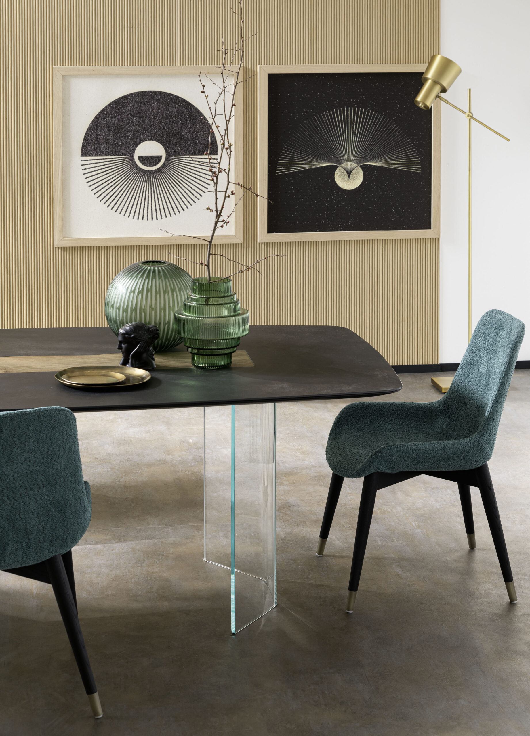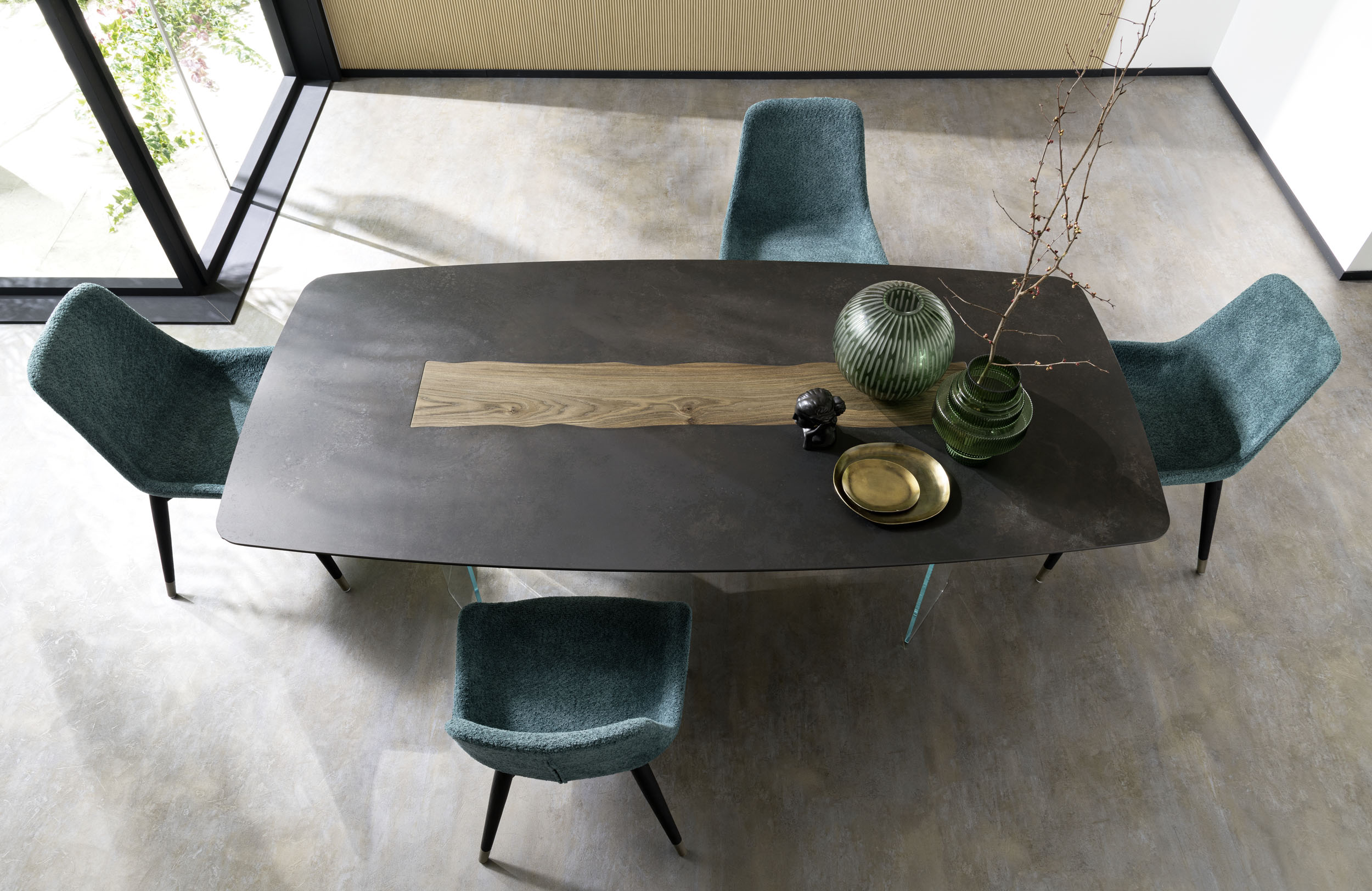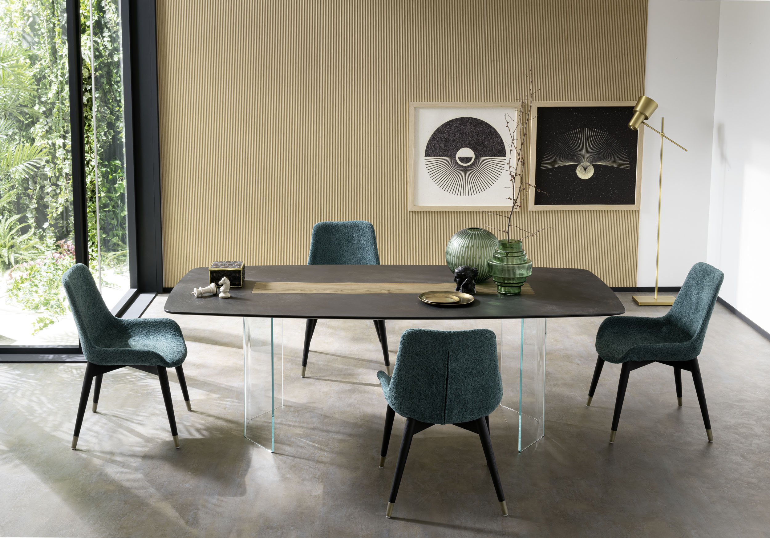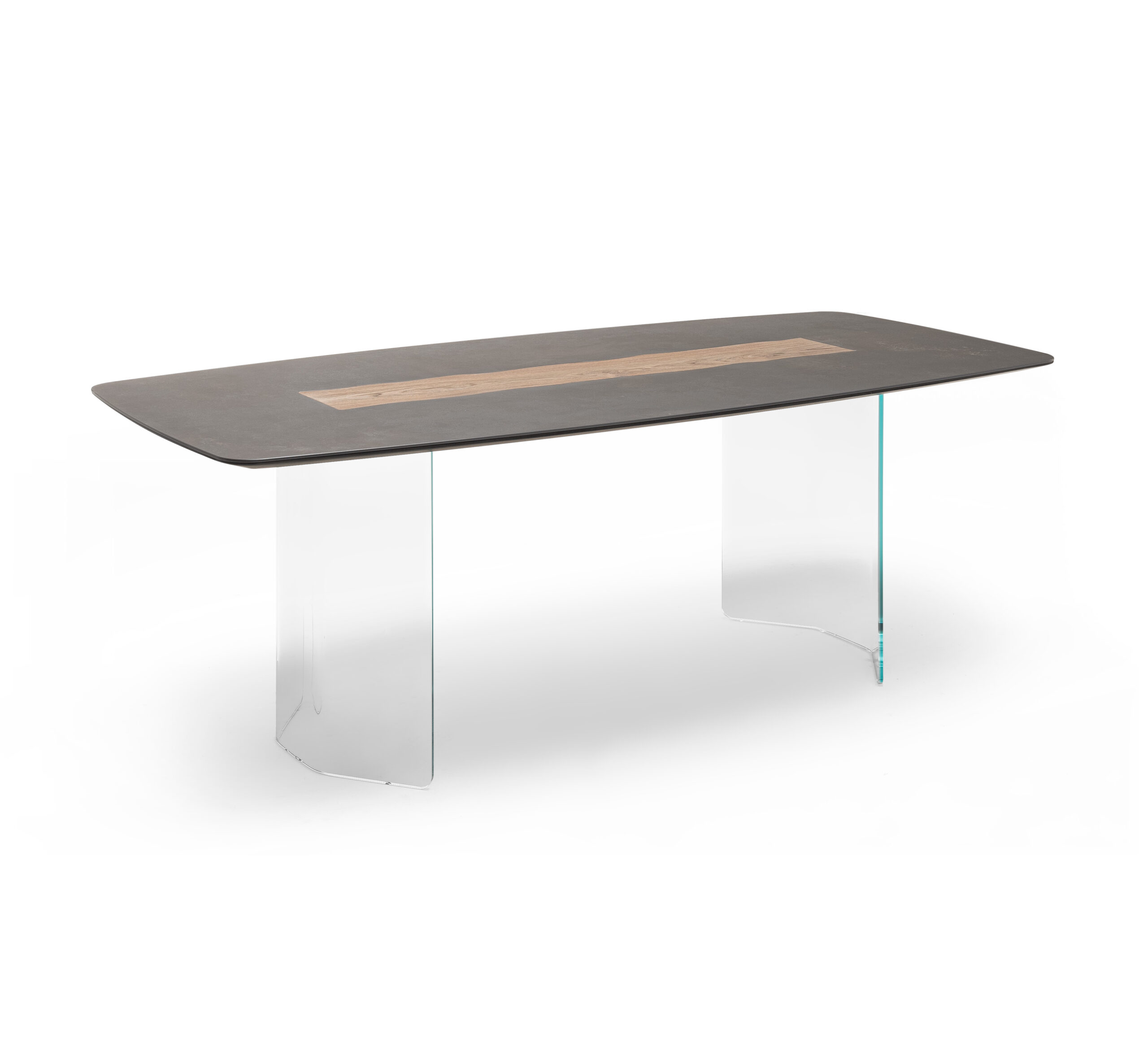 Beine aus extra klarem gehärtetem Glas mit polierter Kante. Platten mit einer Stärke von 40/45 mm aus massiver europäischer Eiche oder Canaletto-Nussbaum mit Sperrholzeinlage, 55/60 mm Stärke aus massiver europäischer Eiche, 64 mm Stärke auf Tischlerplatte oder Sperrholzträger mit glatter oder lattenförmiger oberer, unterer und umlaufender Eicheneinlage oder oval oder rechteckige Platten mit einer Stärke von 36 mm aus Keramik, die auf eine schwarze MDF-Basis geklebt sind. Vinylklebstoffe auf Wasserbasis, Zweikomponenten-Acrylfarben.