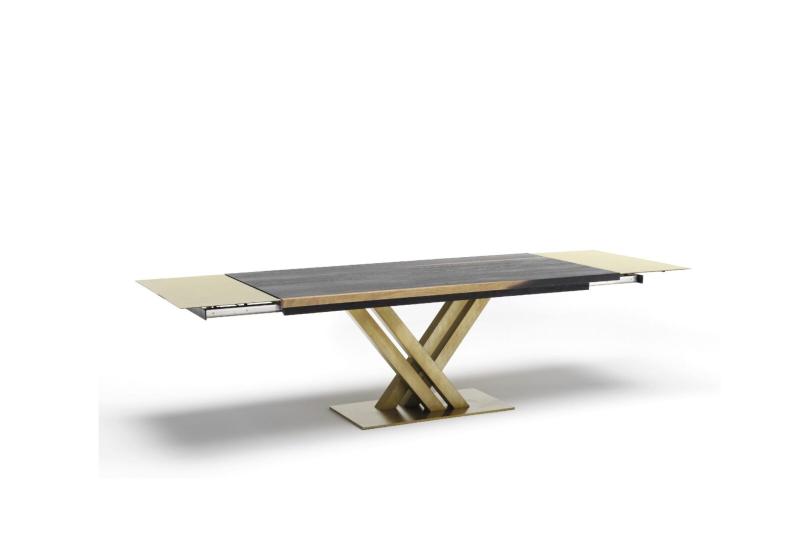 Untergestell aus Eisen kombinierbar mit Platten mit einer Dicke von 30/40 mm auf Trägermaterial aus Leistenholz mit oberer und unterer Furnierauflage in Eichen, Kanteneinfassung aus massivem Nussbaumholz mit entweder regelmäßigen oder unregelmäßigen Kanten. Oberfläche gebürstet. Vinylkleber auf Wasserbasis, Zweikomponenten – Acryllack.