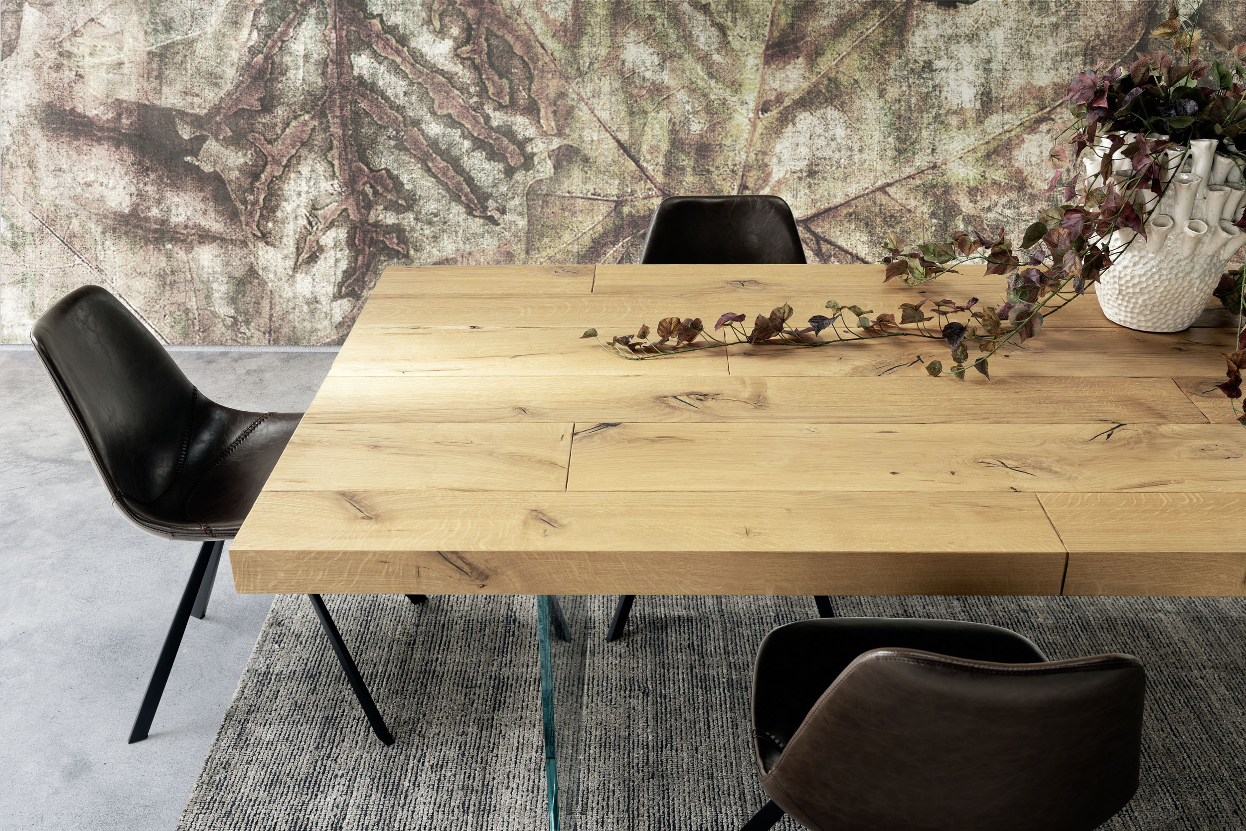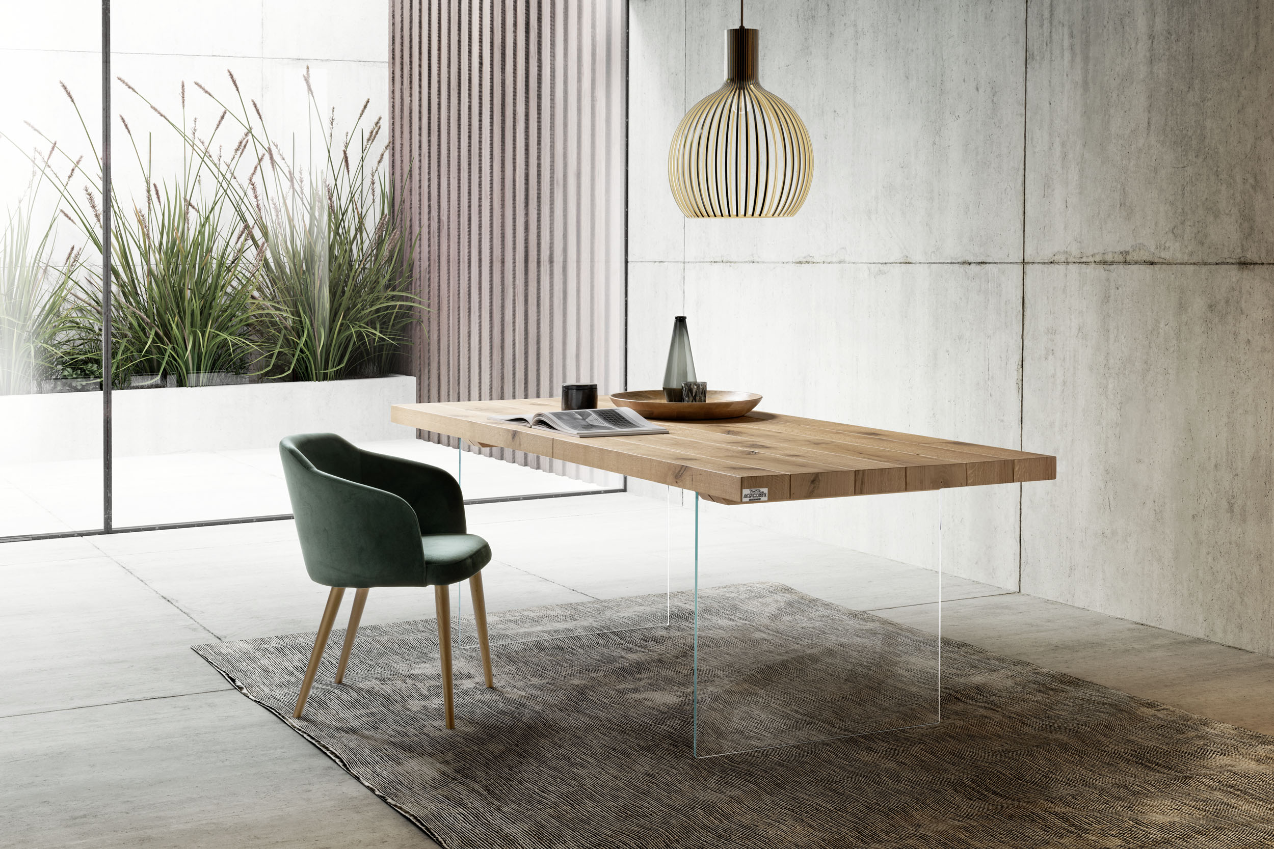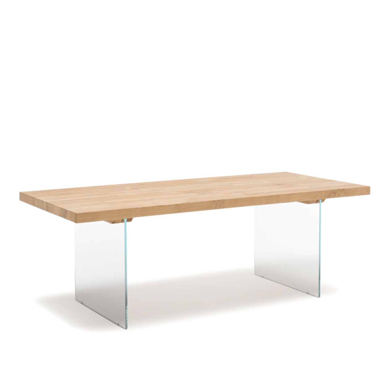 Tischbeine aus ultra-klarem vorgespanntem Kristall mit einer Dicke von nur 15 mm kombinierbar mit Platten mit einer Dicke von 40/45 mm aus europäischem massivem Eichenholz oder Canaletto Nussbaum mit Furnierauflage auf Trägermaterial aus Mehrschichtholz, Platte von 55/60 mm aus europäischem massivem Eichenholz, Platten von 64 mm auf Trägermaterial aus Leisten- oder Mehrschichtholz mit oberer, unterer und umlaufender Furnierauflage (glatt oder in Leistenoptik) in Eiche. Vinylkleber auf Wasserbasis, Zweikomponenten – Acryllack.