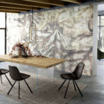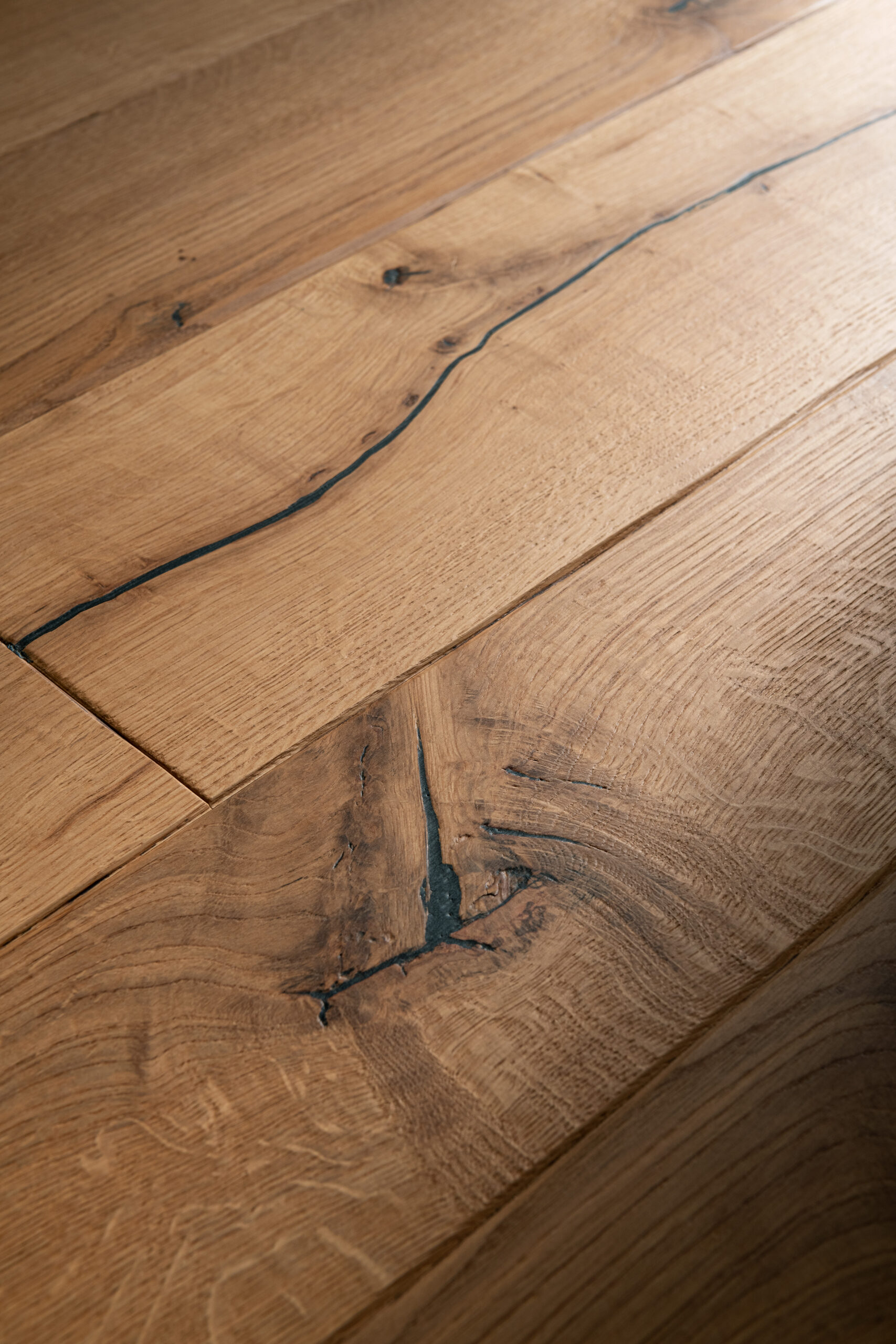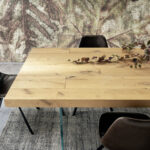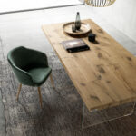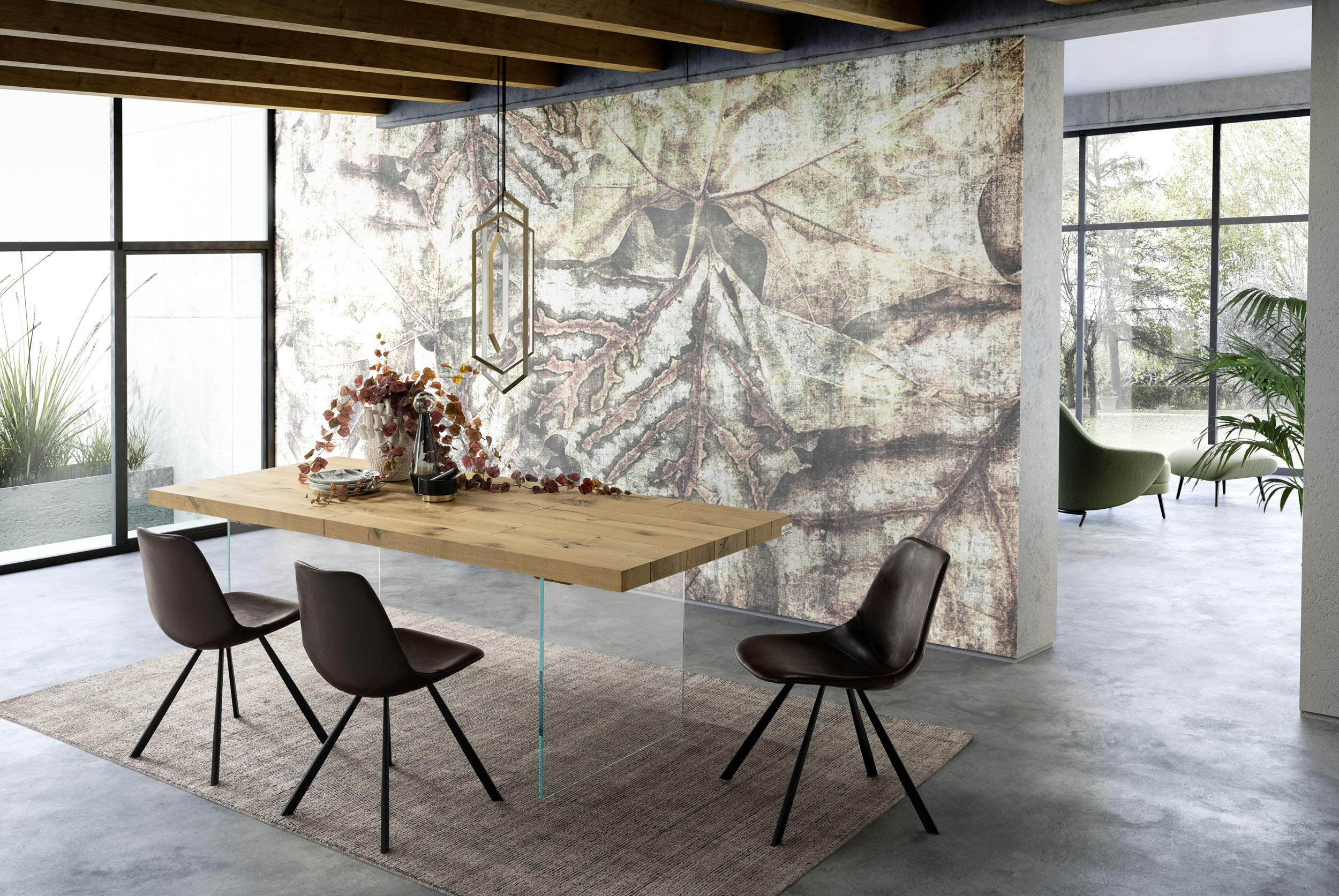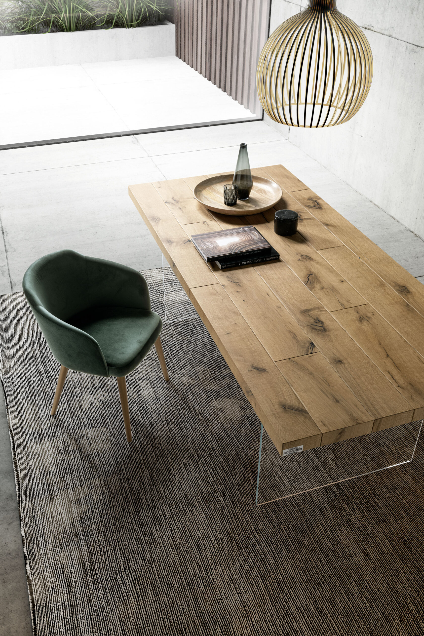 Tischbeine aus ultra-klarem vorgespanntem Kristall mit einer Dicke von nur 15 mm kombinierbar mit Platten mit einer Dicke von 40/45 mm aus europäischem massivem Eichenholz oder Canaletto Nussbaum mit Furnierauflage auf Trägermaterial aus Mehrschichtholz, Platte von 55/60 mm aus europäischem massivem Eichenholz, Platten von 64 mm auf Trägermaterial aus Leisten- oder Mehrschichtholz mit oberer, unterer und umlaufender Furnierauflage (glatt oder in Leistenoptik) in Eiche. Vinylkleber auf Wasserbasis, Zweikomponenten – Acryllack.