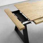 Beine aus Stahl, kombinierbar mit rechteckigen Platten aus Eichenholz St. 20/50 mm auf Trägermaterial aus Leistenholz, mit gerader Kante, ausziehbar. Vinylkleber auf Wasserbasis, Zweikomponenten – Acryllack.