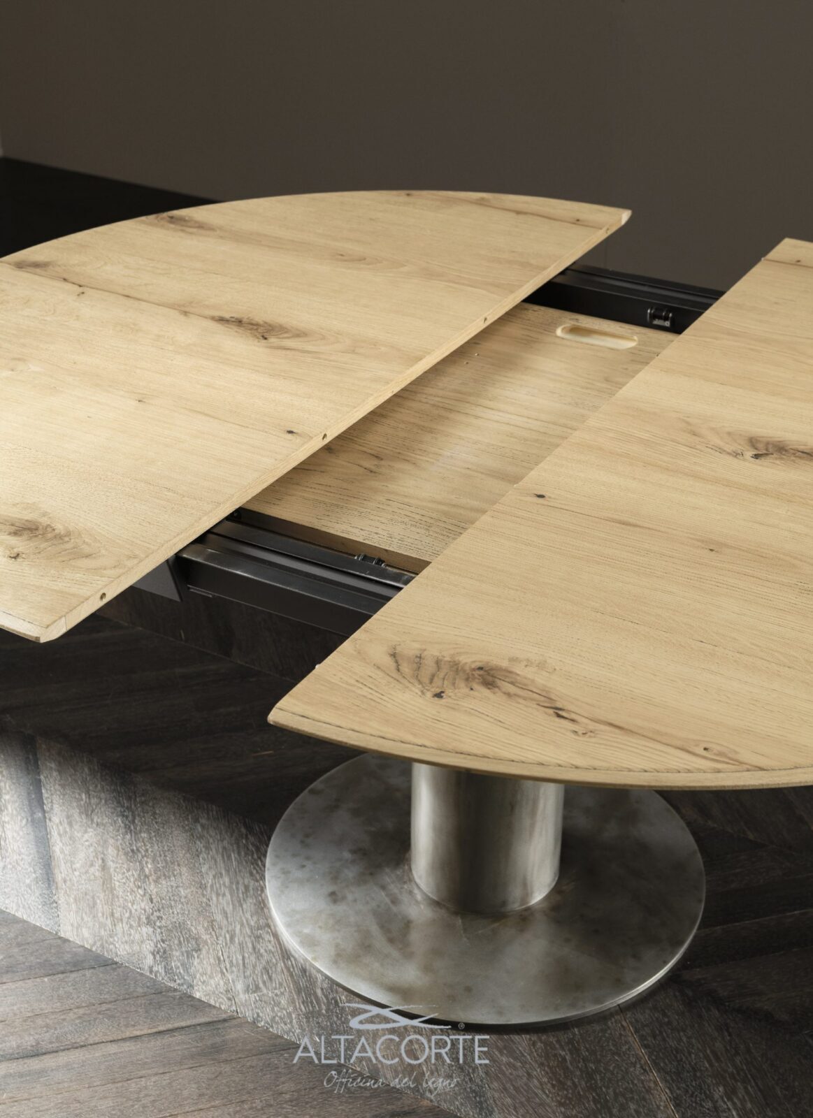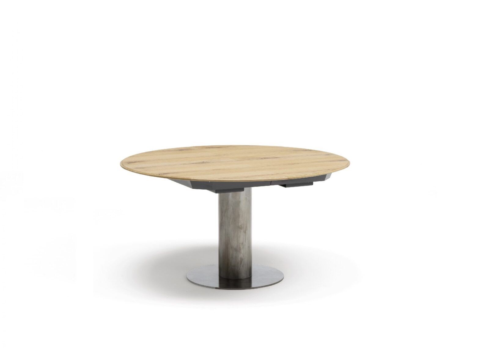 Untergestell aus Stahl, kombinierbar mit 20 mm dicken runden Tischplatten auf Tischlerplattenträger mit oberer und unterer Eichenplatte, deren Kanten mit einer Umfangspolsterung aus massiver Eiche geformt sind. Auch in Canaletto-Walnuss erhältlich. Vinylklebstoffe auf Wasserbasis, Zweikomponenten-Acrylfarben. Endlich auch mit einer 12 mm dicken Platte (6 mm Keramik + 6 mm Glas) mit einer Verlängerung von 600 mm erhältlich.