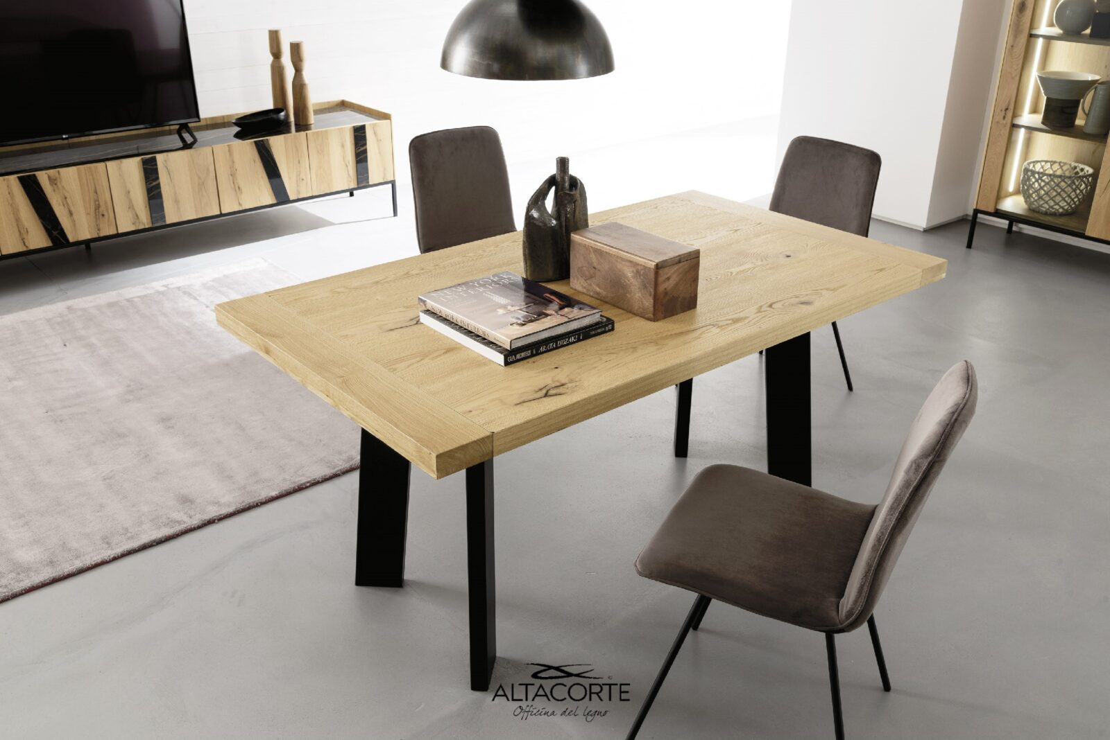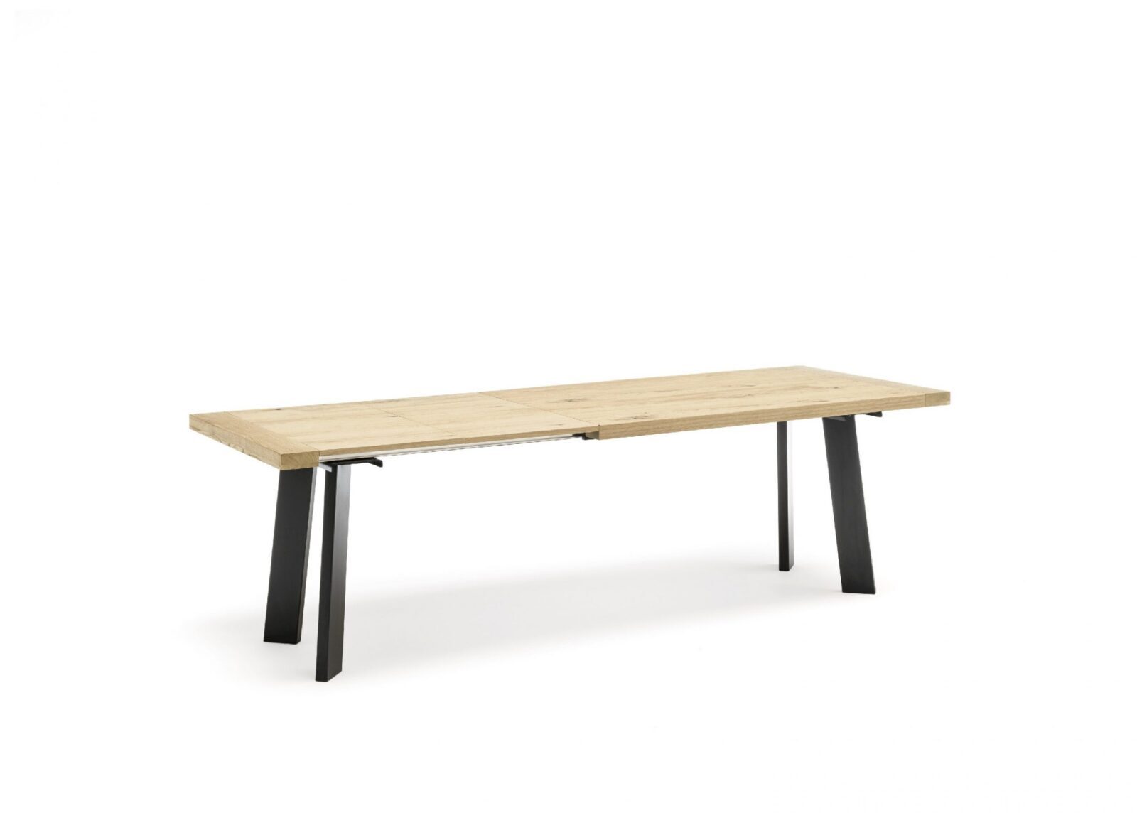 Beine aus Stahl, kombinierbar mit rechteckigen Platten aus Eichenholz St. 20/50 mm auf Trägermaterial aus Leistenholz, mit gerader Kante, ausziehbar. Vinylkleber auf Wasserbasis, Zweikomponenten – Acryllack.